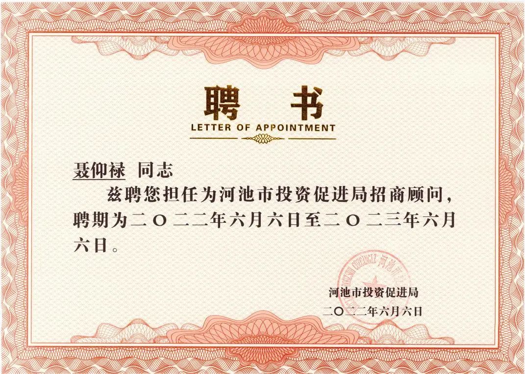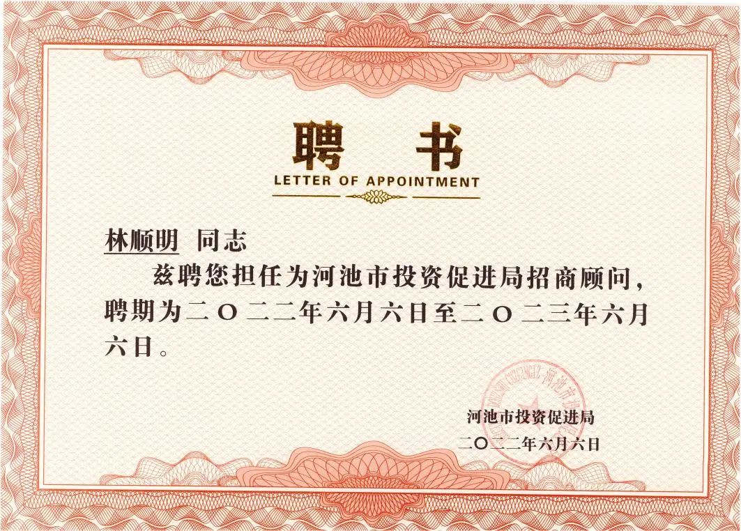 2021年12月以来,深企投为河池市提供了“产业链招商策略+委托招商”一体化服务,得到了河池市委、市政府领导的高度认可。近日,广西河池市投资促进局特聘深企投董事长聂仰禄、副总经理林顺明为招商顾问。