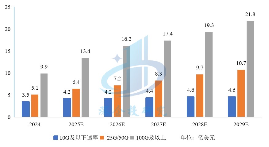 在电信侧应用场景,主要包括骨干网、城域网、无线接入(移动通信)和光纤接入(以PON为核心方案)等。2024年,光纤接入成为电信侧应用市场增长的主要驱动力,光通信电芯片按10G及以下速率、25G/50G速率和100G及以上(含128Gbaud)速率划分。据ICC讯石咨询统计,2024年全球电信侧光通信电芯片市场规模达到18.5亿美元;预计到2029年底全球电信侧光通信电芯片市场规模将达到37亿美元,复合年增长率(CAGR)为14.97%。