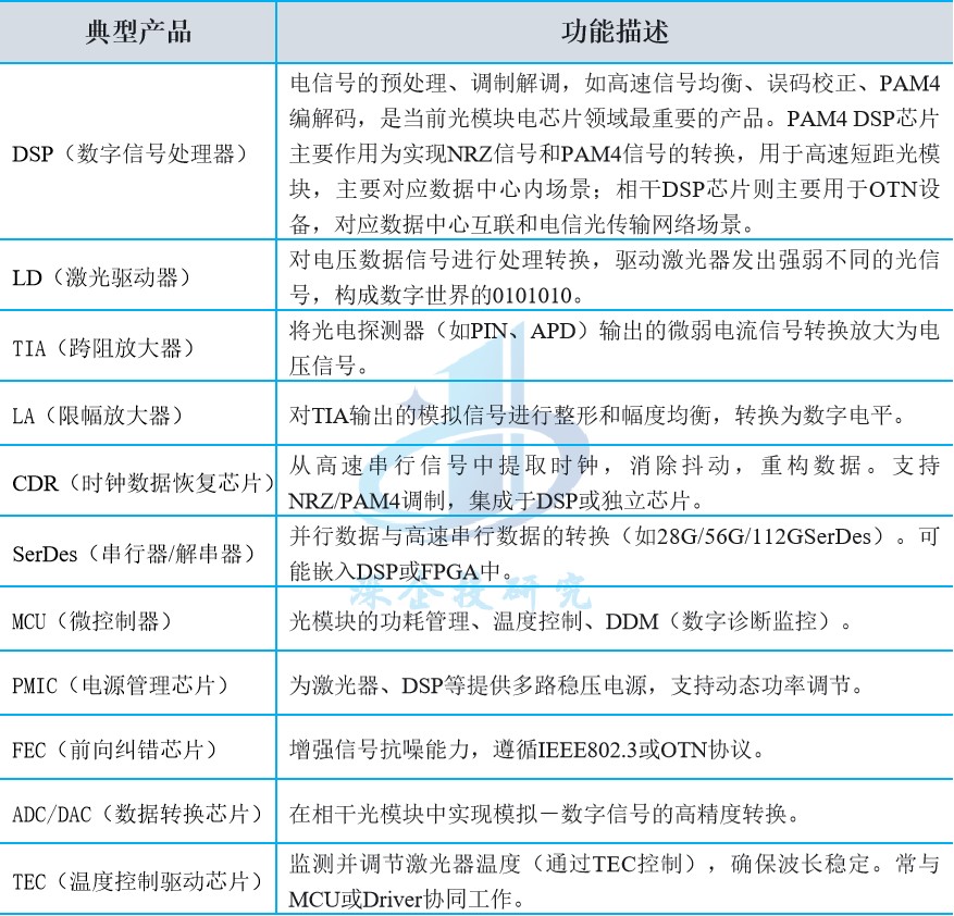 光通信电芯片承担着对光通信电信号进行放大、驱动、重定时以及处理复杂数字信号的重要任务,其性能直接影响整个光通信系统的性能和可靠性。电芯片根据不同的功能分为DSP(数字信号处理器)、LD(激光驱动器)、TIA(跨阻放大器)、LA(限幅放大器)、CDR(时钟数据恢复芯片)等,具体如下表所示。