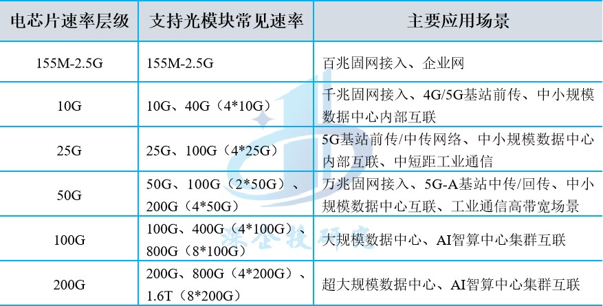 光通信电芯片的速率演进直接决定了光通信网络的传输效率与容量。随着AI智算中心及传统数据中心需求的爆发,电芯片技术从低速率向高速率持续升级,逐步形成多层级速率体系。电芯片与光模块之间的速率并非总是直接对应,特定速率的电芯片,通过不同数量的通道聚合,可以对应不同速率级别的光模块。常见的对应关系及应用场景如下: