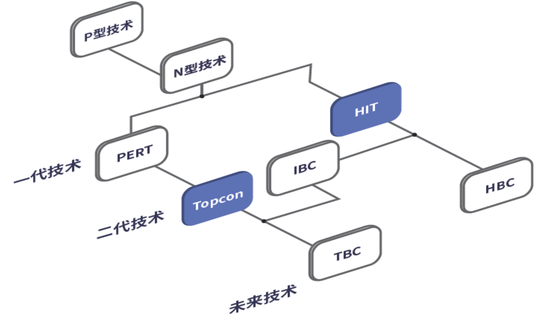 N型电池片阶段,多种技术路线并行。在2021年,PERC仍是主流的电池片技术,由于PERC电池的产业化平均光电转换效率达23.1%逼近其理论极限,更高转换效率的N型技术路线替代PERC成为主流电池片技术已成为大势所趋。光伏电池片技术从P型转向N型时代出现了较为明显的技术分流:一类是以TOPCon为代表的延续性技术,工艺与P型时代主流的PERC技术一脉相承,目前仍具有技术升级空间;另一类以HJT为代表,性能上具有众多优势,但产线、工艺与PERC时代互不相通。在N型电池片阶段出现技术分流,形成TOPCon/IBC/HJT多种技术路线并行的局面。