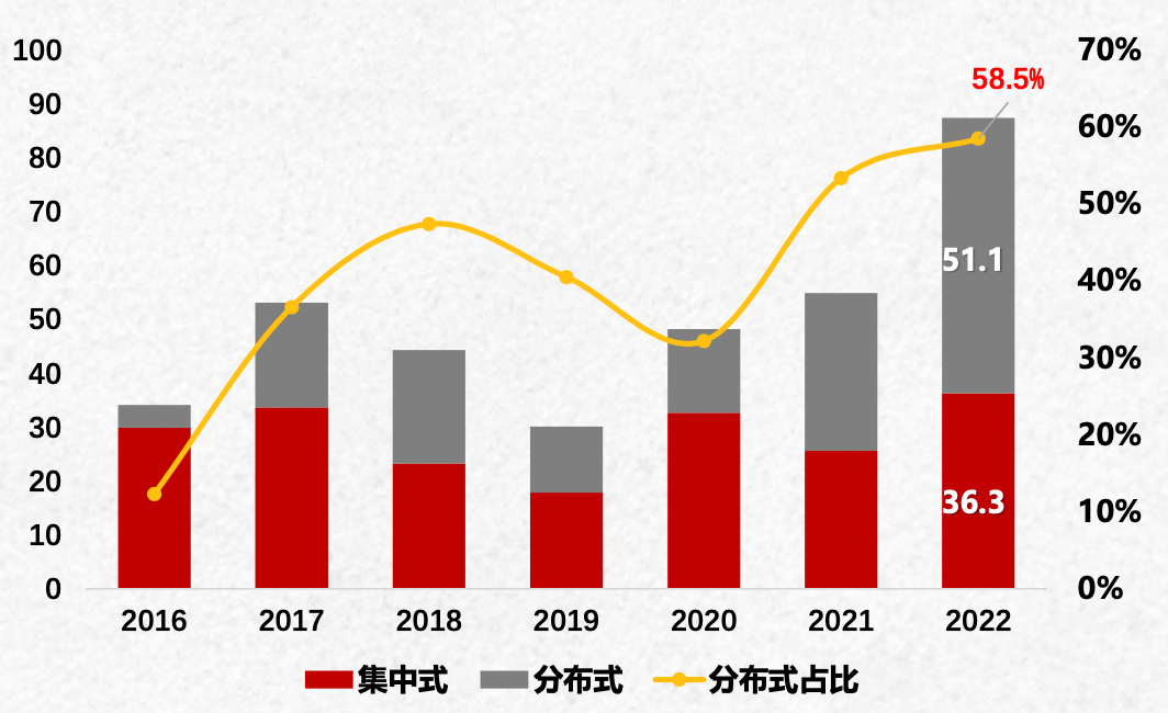 我国光伏新增和累计装机容量占全球光伏装机总规模的1/3以上,新增光伏装机规模和新增总装机容量分别连续10年、8年位居全球第一。2022年全国新增光伏并网装机容量87.41GW,同比增长59.3%,约占全球新增装机的38%,其中集中式光伏新增36.3GW,同比增长41.8%;分布式光伏新增51.1GW,同比增长74.5%;累计光伏并网装机容量达到392.6GW,全年光伏发电量为4276亿千瓦时,同比增长30.8%,约占全国全年总发电量的4.9%。