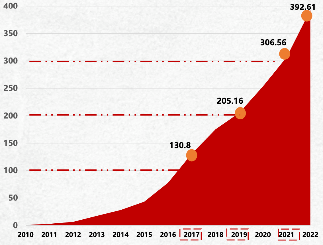 图6 2010-2022年全国太阳能光伏发电装机累计容量(GW)