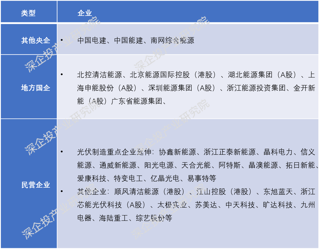 我国光伏投资企业众多,目前呈现国家队、大型央企、国企占行业主导地位,光伏产业链企业和民营企业充分参与的格局。2022年五大六小新增光伏装机量45.27GW,占全国的52%。部分央企以自建或合资模式同时向光伏电池片及组件制造延伸,但仅能满足部分需求。其他电力建设行业央国企、地方能源国企也广泛参与;光伏产业链头部厂商也向光伏电站投资延伸。