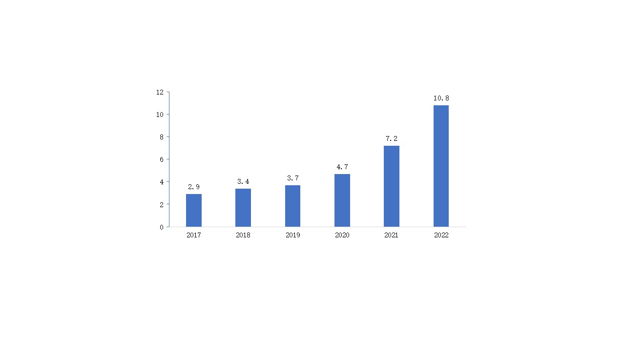 包蓝膜机处于锂电池制造后段工序环节,主要用于锂电池电芯外表贴绝缘膜、底部与顶部折边、贴绝缘片、尺寸测量、绝缘性测量等。GGII数据显示,2022年全球包蓝膜设备的市场规模为15亿元,其中国内包膜设备的市场规模为10.8亿元,同比增长50%,如下图所示。