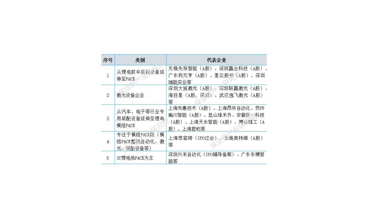 表1 我国动力及储能锂电模组PACK设备代表企业分类