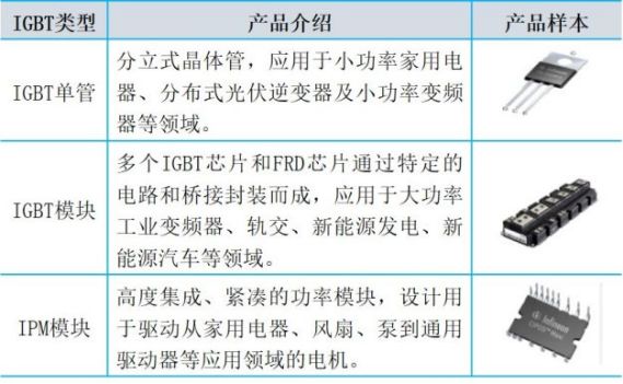 —IGBT:绝缘栅双极型晶体管,由MOSFET和BJT组合而成复合全控型电压驱动式功率半导体器件,既有MOSFET输入阻抗高、驱动功率小、开关速度快特性,又兼具BJT导通电压低、通态电流大、损耗小的优点,在高压、大电流、高速等方面具有独特优势,驱动功率小而饱和压降低,可实现逆变、变频功能。主要适用于中低频率、高功率的工作环境,广泛应用于逆变器、变频器和电源开关等领域,在低压主要应用于变频白色家电、新能源汽车零部件等领域,在中压常用于工业控制、新能源汽车等领域,在高压领域广泛应用于轨道交通、新能源发电和智能电网等重要领域,被称为电力电子行业的“CPU”。按照封装形式,IGBT产品可分为IGBT单管(IGBT分立器件)、IGBT模块和IPM模块。