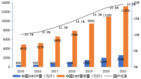 图10 2015-2021年IGBT国产化率(按产量端口径)