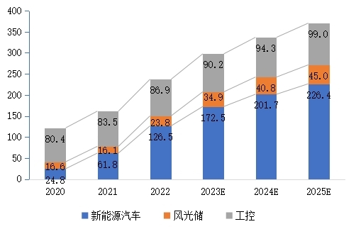 新能源行业成为我国IGBT发展主要驱动力。IGBT广泛应用于新能源、汽车、工业、家电等领域,随着近年来我国新能源车销量以及风电光伏装机量快速增长,带动IGBT领域迅速发展。2022年,中国车用IGBT的市场份额已经超过工控,达到39.3%,成为IGBT下游第一大应用,预计到2025年份额有望进一步增长至接近50%。2022年中国新能源汽车IGBT市场规模达到126.5亿元,在2025年有望增加到226.4亿元,2022-2025年CAGR达21.4%。此外,2022年中国风光储IGBT市场规模为23.8亿元,2025年有望达到45亿元,2022-2025年CAGR达23.7%。
