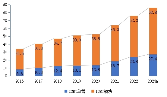图7 2016-2023年全球IGBT市场规模(亿美元)