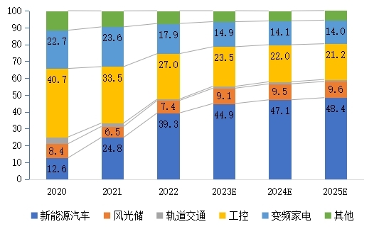 图8 2020-2025年中国IGBT主要下游应用市场份额(%)