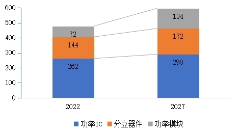 图5 2022年-2027年全球功率半导体市场规模(亿美元)