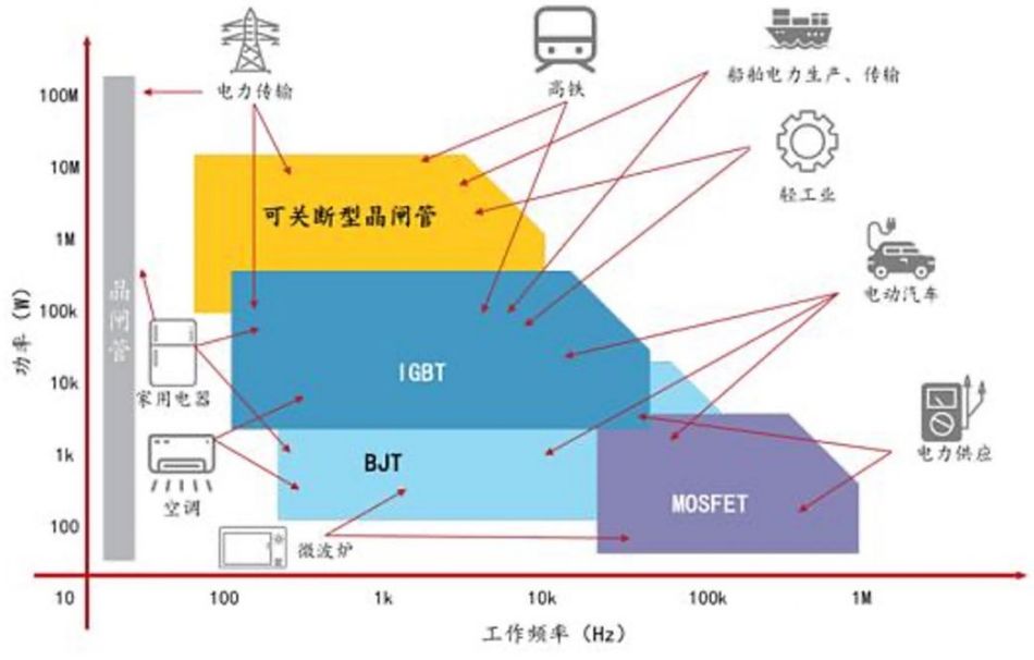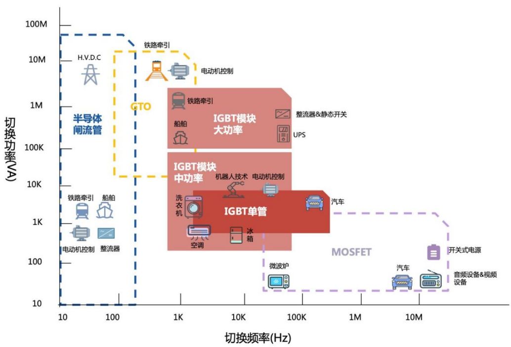 按照功率和工作频率,主要功率器件的应用领域如下图所示: