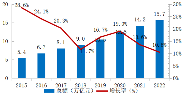 图1 2015-2022年中国跨境电商行业交易规模及增长率
