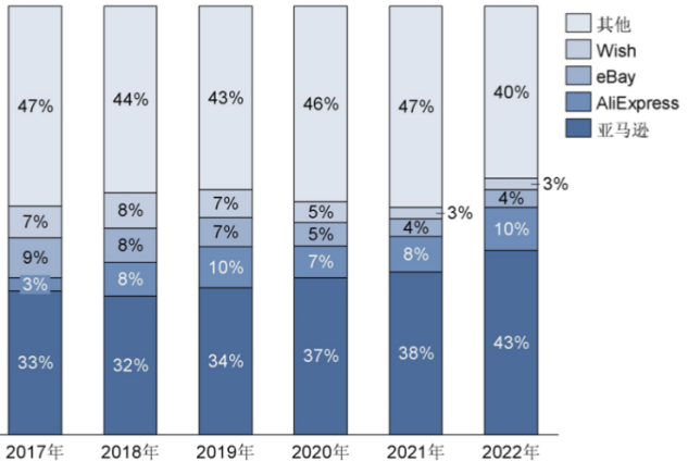 从渠道看,中国电商出海以亚马逊等海外成熟渠道为主,国内平台占比逐步扩大。我国出口跨境电商品牌企业一般依托亚马逊、阿里巴巴、eBay、Wish等第三方平台经营业务,少数自建独立站。亚马逊、eBay和Wish在内的海外平台占比50%左右,以阿里速卖通为首的国内出海平台占比逐年扩大,从17年的3%增长到22年的10%,随着海外流量成本提升,竞争日益激烈,独立站份额有下降趋势。多数卖家布局自营网站主要为了避免过度依赖单一平台带来的风险。自营网站需要商家独立完成导流履约等环节,随着海外流量红利结束,流量成本增加,对网站留存率和复购率要求更高,品牌商家商品质量更高、履约等客户体验更有保障,更容易沉淀复购率。