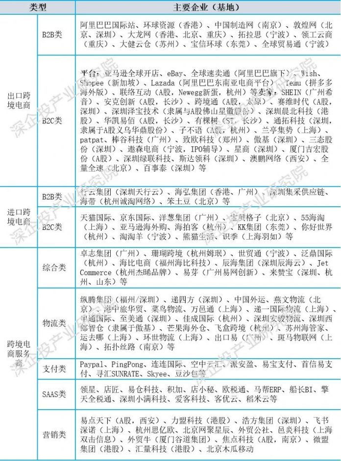 我国跨境电商大型企业较多聚集在深圳、浙江(如宁波、杭州)、广州、上海等外贸发达的地区,各领域主要企业及品牌如下表所示。