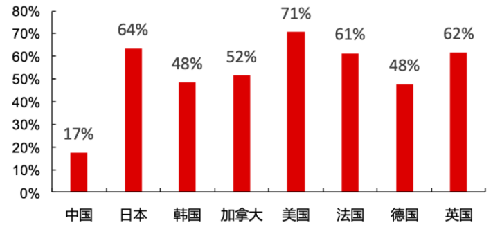 经过近百年的发展,海外发达国家的宠物市场已进入成熟期。美国是最大最成熟的市场,根据欧睿国际数据,2022年美国、欧洲、日本在全球宠物食品行业市场规模占比分别为38%、26%、3.2%。根据APPA(美国宠物产品协会)披露,2021年美国宠物行业市场规模约1236亿美元,相较于2020年的1036亿美元增长约19.31%,其中宠物食品约500亿美元,占宠物行业总体规模的40.45%。美国宠物家庭渗透率从1988年的56%上升到2021年的70%。