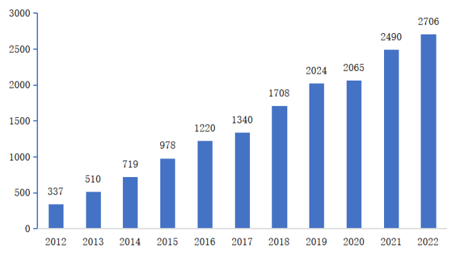 我国宠物行业市场规模呈现稳步上升的态势。我国居民养宠意愿有所提高。宠物成为了家庭成员们的伴侣、朋友与玩伴,越来越多的家庭开始接纳养宠生活方式。在人口老龄化、结婚年龄不断推迟、独居人口比例逐渐提升的社会背景下,人们对于宠物陪伴的精神需求日渐凸显。养宠家庭渗透率稳定增长,根据艾瑞咨询,2021年我国一、二线城市养宠家庭渗透率达39.1%,以宠物猫及宠物犬为主的宠物数量规模增长。2012年我国城镇宠物(犬猫)消费市场规模仅有337亿元,根据《2022年中国宠物行业白皮书》的数据显示,2022年消费市场规模达到2706亿元,比2021年增长8.67%, 2012-2022年复合增长率为23.16%,如下图所示。