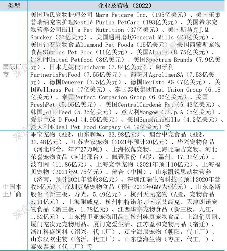 资料来源:PET FOOD INDUSTRY,各公司财报,网络信息检索,深企投产业研究院整理。部分企业仅有品牌,生产委托代工厂。