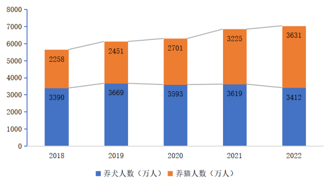 2022年我国饲养犬猫的人群数量达到7043万人,较2021年增加2.91%,去除同时饲养犬猫情况的人群数量为6729万人,同比增长6.1%。2022年全国城镇养犬人数为3412万人,养猫人数为3631万人,养猫人群已超过养犬人群,较2021年同比增速达12.59%,如下图所示。