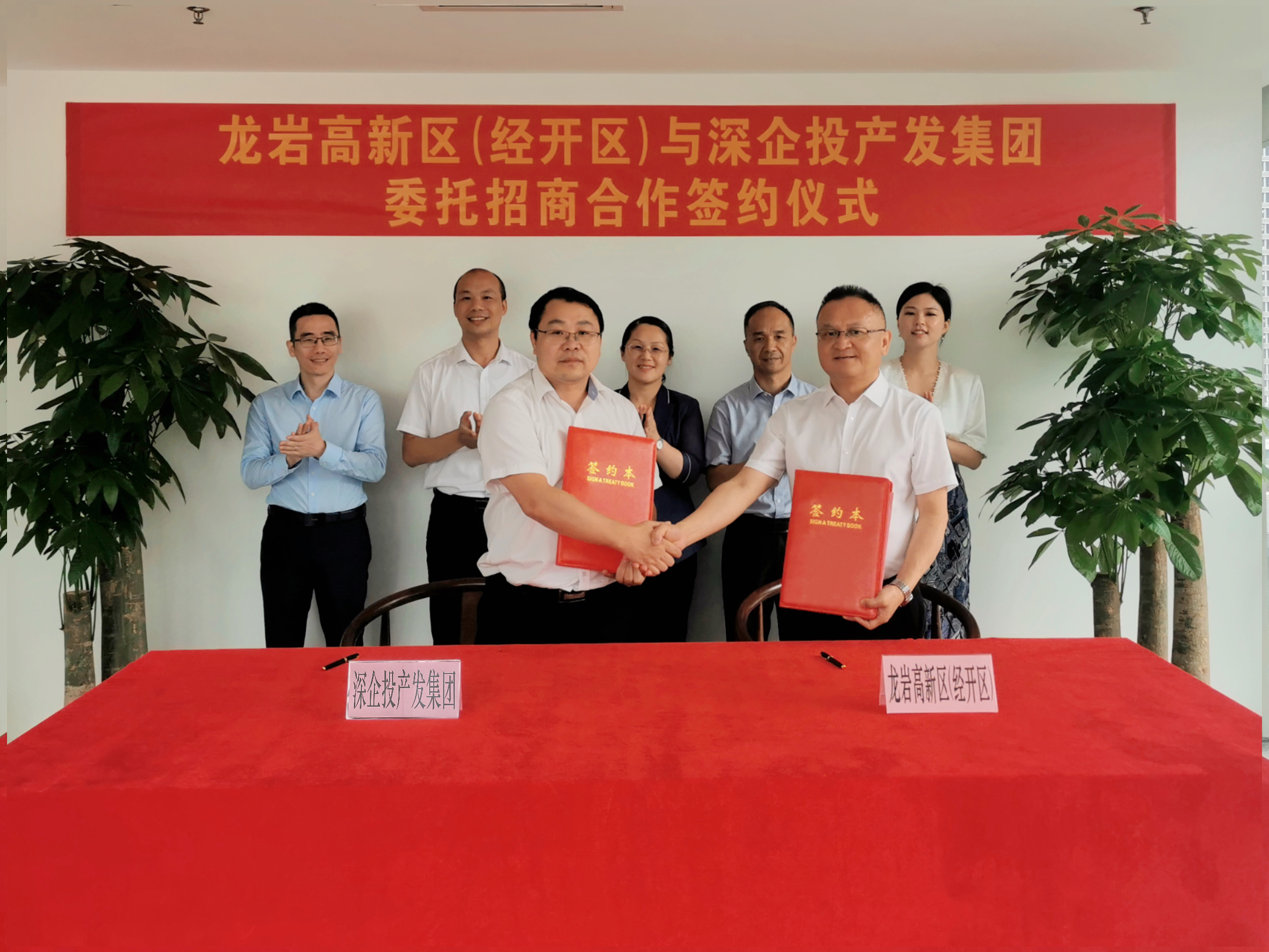 6月29日,龙岩高新区(经开区)与我司签署委托招商合作协议,并举行龙岩高新区(经开区)深圳招商联络处揭牌仪式。龙岩高新区(经开区)党工委书记、管委会主任袁静、龙岩高新区(经开区)管委会综合办主任罗勇、龙岩高新区(经开区)投促中心负责人王高红、深企投产发集团董事长聂仰禄、总经理陈小剑、深企投产业研究院院长林和坤、副总经理游双等领导出席签约及揭牌仪式。