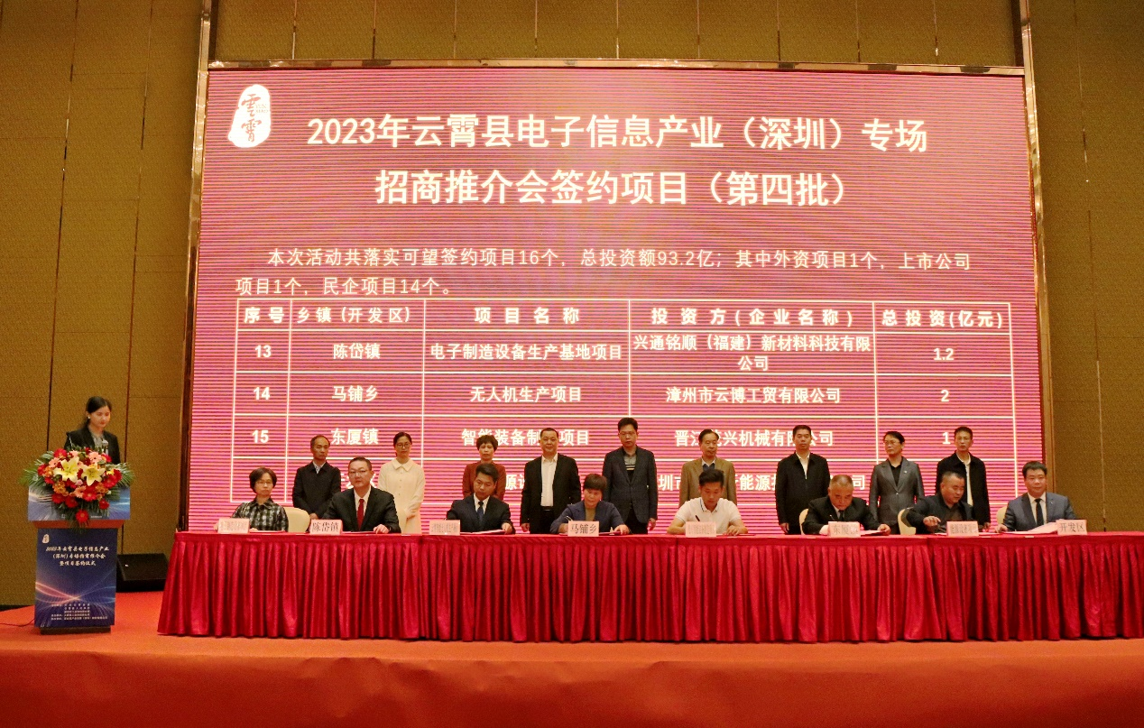 当天,还举行了项目签约仪式,与会县领导现场见签。本次推介会签约项目共16个、总投资93.2亿元。这些项目成功签约对云霄电子信息产业延链强链补链起到了重要推动作用。这既是云霄主动融入省市发展大局,抢先机、落项目、布新局的一项招商新成果,也是县域主导产业高质量发展进程中的重要一环,更意味着新一轮更加密切、更加实际的政企合作即将开启。