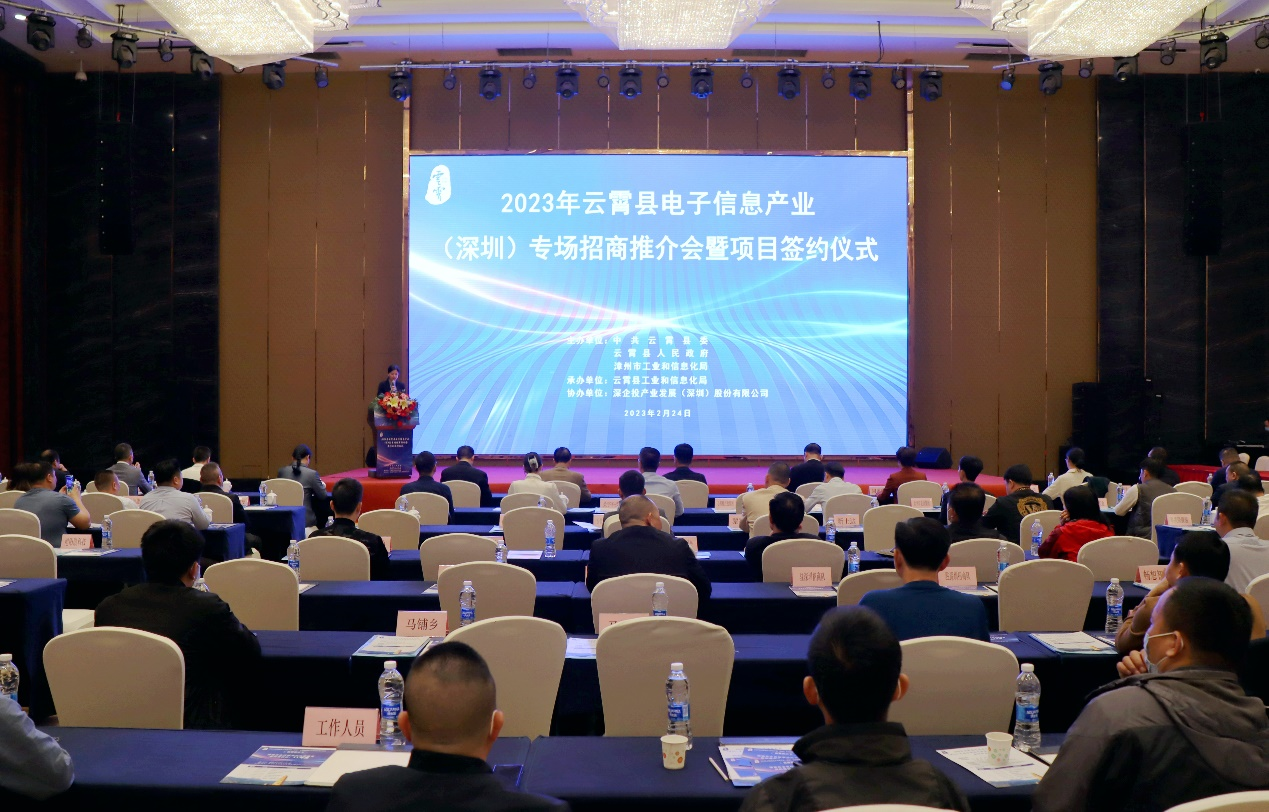 2023年2月24日,由中共云霄县委、云霄县人民政府以及漳州市工信局联合主办,云霄县工信局承办,深企投产发集团协办的“2023年云霄县电子信息产业(深圳)专场招商推介会暨项目签约仪式”在深圳成功举行。深企投邀请了粤港澳大湾区新一代电子信息产业领域的60余家行业内骨干企业参会。