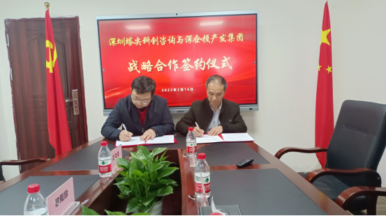 2023年2月16日上午,深企投产业发展(深圳)股份有限公司(简称“深企投”)与深圳市塔尖科技创新咨询有限公司(简称“塔尖科创咨询”)举行战略合作签约仪式。双方围绕高端政策咨询、招商引资、产业规划等达成战略合作,深企投董事长聂仰禄与塔尖科创咨询董事长王显锋代表双方签署战略合作协议。