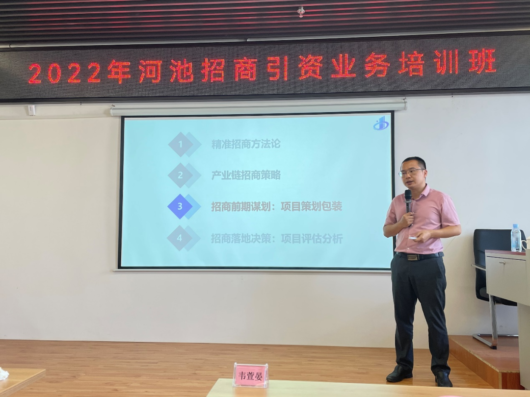 近日,由河池市投资促进局主办的《2022年河池招商引资业务培训班》在河池韦拔群干部学院开班授课。深企投董事长聂仰禄、策划咨询部总经理李星光受邀分别为全体河池市招商系统干部作“围绕‘六新河池’目标,建设绿色发展先行试验区——产业招商方法、技巧及实务”、“精准招商方法论及产业链招商策略”专题教学培训。