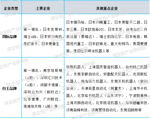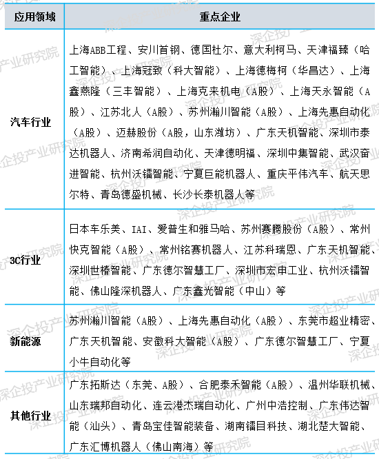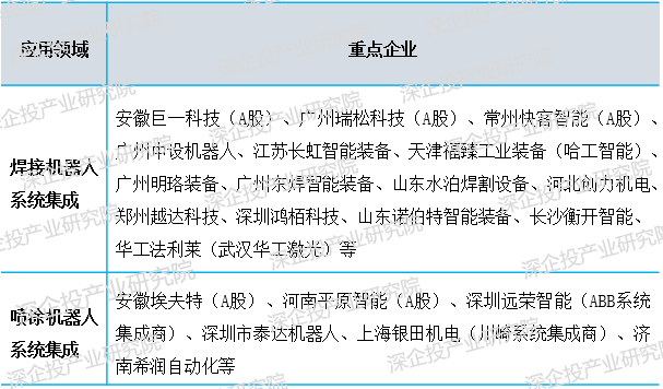 按照工业机器人的形态分类,焊接机器人、喷涂机器人等主要系统集成领域的重点企业如下表所示。