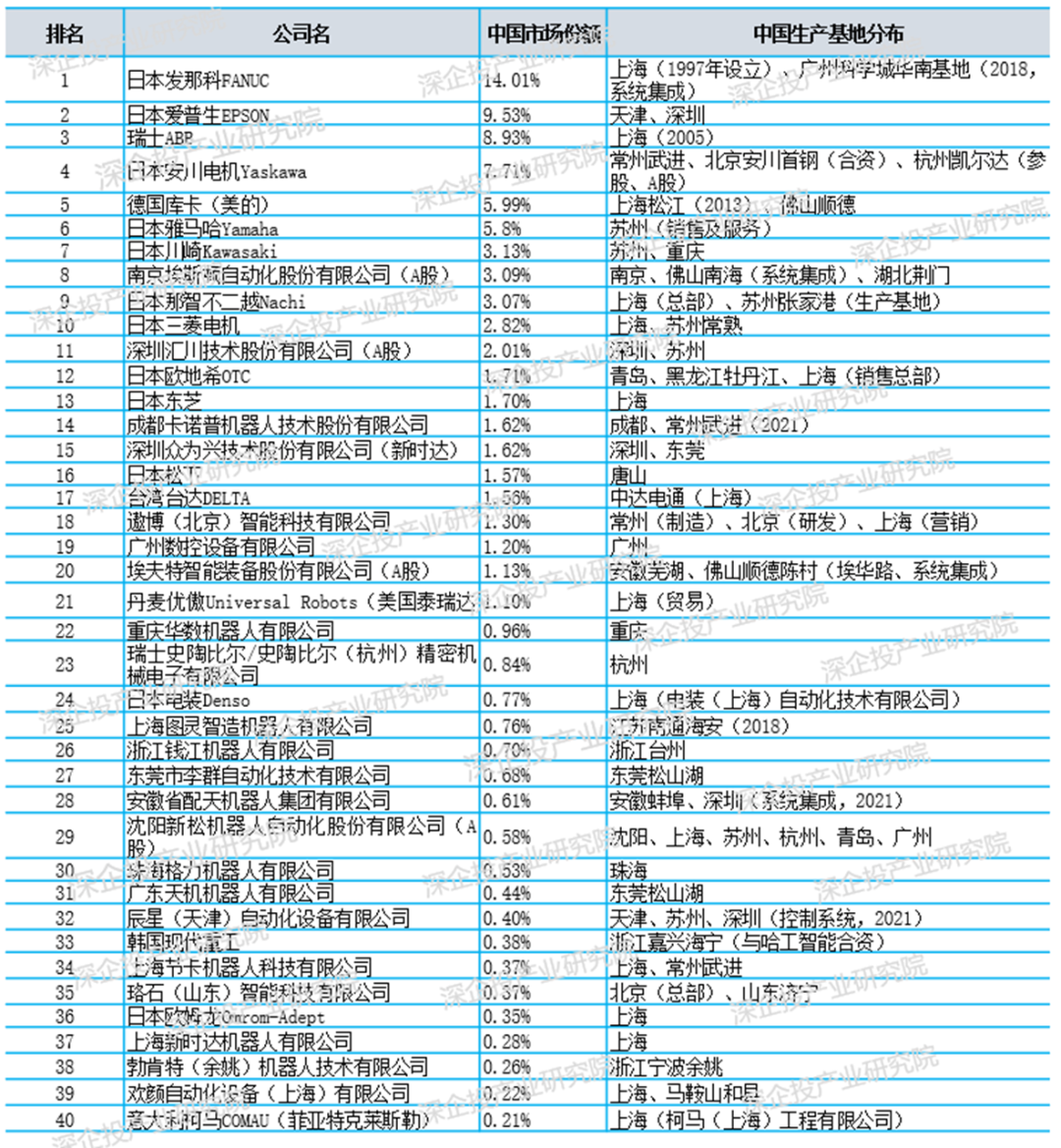 2020年我国工业机器人前40名企业的基地分布如下表所示。