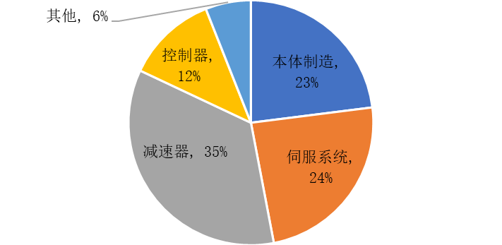 全球工业机器人本体重点企业多数已在中国设立生产基地,当前机器人本体国产化率已达到30%左右。下游系统集成领域国产化程度高。上游核心零部件技术壁垒与价值量最高,总体国产化程度较低,导致其占中国工业机器人生产成本比重较高。根据头豹研究院数据,我国工业机器人生产成本结构如下图所示,其中本体制造占比23%,伺服系统、减速器、控制器三大核心零部件占比达70%以上,当前国产化率分别为15%、10%和13%。