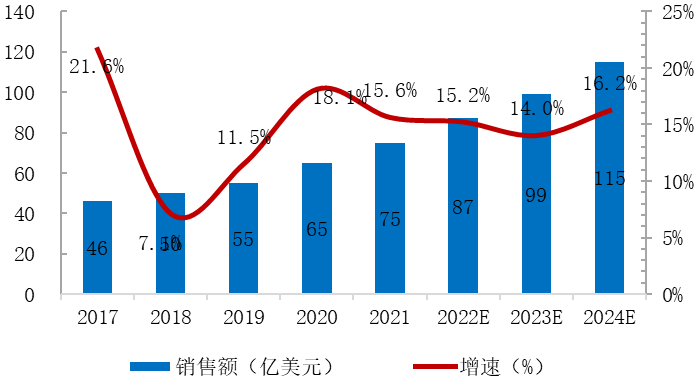 在国内密集出台的政策和不断成熟的市场等多重因素驱动下,我国工业机器人增长迅猛,除了汽车、3C电子两大需求最为旺盛的行业,化工、石油等应用市场逐步打开。根据IFR统计测算,近五年中国工业机器人市场规模始终保持增长态势,2022年市场规模将继续保持增长,预计将达到87亿美元,预计到2024年,中国工业机器人市场规模将超过110亿美元,如下图所示。