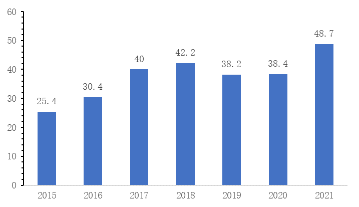 国际机器人联合会(IFR)发布的《世界机器人2021工业机器人报告》显示,全球工厂中运行的工业机器人达到300万台。2015年以来,全球工业机器人安装量总体保持增长。2020年全球工业机器人出货量38.4万台,尽管受新冠疫情影响,得益于中国市场的积极发展,仍比2019年增长了0.5%。2021年全球工业机器人安装量创下历史新高,达到48.7万台,同比增长27%。