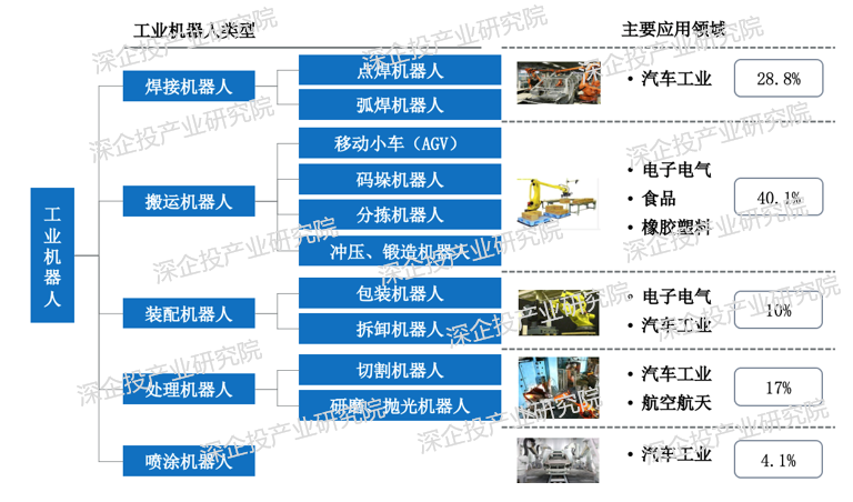 机器人主要可分为工业机器人、服务机器人和特种机器人,主要产品如下图所示。