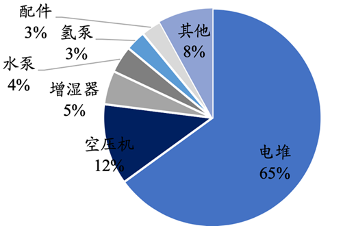 燃料电池系统主要由电堆及系统辅件(即BOP,包含氢循环系统、空气系统、水热管理系统等)构成。其中电堆为电化学反应发生场所,是燃料电池动力系统的功能核心和价值量中心,在燃料电池系统中的成本占比高达约65%。此外,燃料电池系统核心配件还包括空压机、增湿器等,在燃料电池系统中价值占比分别为12%和5%,也是国产化降本的重要突破点。
