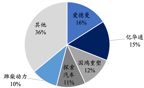 国际领先的燃料电池系统企业包括丰田汽车、巴拉德(潍柴动力是巴拉德第一大股东)等。我国燃料电池系统主要企业包括广东爱德曼(佛山南海)、北京亿华通(A股)、大连新源动力、上海重塑能源(科创板已申报)、广东国鸿氢能(云浮)、江苏清能股份(苏州张家港)、中山大洋电机(A股)、深圳雄韬股份(A股)、潍柴动力(A股)、广东探索汽车(佛山南海,重塑能源控股)、上海电驱动、福建雪人股份(A股)等。从技术层面来看,国内燃料电池系统在额定功率、质量功率密度、低温启动能力等关键指标上已逐步接近国际领先水平。2020年我国燃料电池系统行业集中度如下图所示。