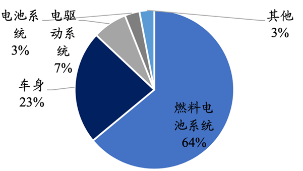 传统氢燃料电池汽车包含燃料电池系统、电驱动系统、电池系统等功能部件,其中燃料电池系统 技术壁垒高,是决定FECV氢燃料电池整车性能的核心环节。从成本端看,燃料电池系统是FECV整车的价值量中心,在整车成本中的占比高达64%,如下图所示。