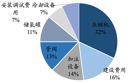 政策加码下我国加氢站扩建力度加大,受制高昂投资成本,我国加氢站尚未实现商业化运营。加氢站三大核心设备包括氢气压缩机、加注设备和储氢系统,其中压缩机和加注设备价值量较高,分别约占我国加氢站投资额的32%和14%,仍高度依赖于进口,是我国加氢站设备国产化的主要降本点。