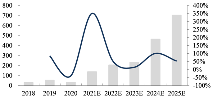 燃料电池市场正在快速打开,本土设备公司加速布局。燃料电池汽车正处在快速导入期,GGII预测2023年市场燃料电池行业规模将达230亿元,2025年达700亿元,如下图所示。