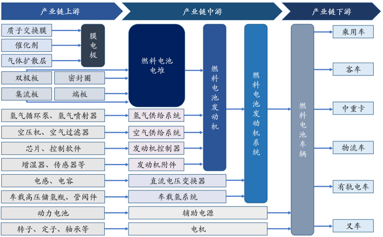 燃料电池系统的产业链如下图所示。