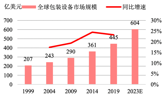 全球包装设备行业规模接近500亿美元,其中食品、饮料以及医疗为最主要下游应用领域。根据The Freedonia Group,Inc报告,2019年全球包装设备市场规模约445亿美元,并预计在2023年达到604亿美金,预计整体保持5%左右的年均增速。从地区来看,根据其预测发展中国家和地区包装设备销量的增长将成为全球包装设备发展的推动力,中国作为最大的发展中国家,对包装设备的需求将构成世界最大的市场之一;从下游应用领域来看,2019年全球包装设备机械中前三大终端应用领域分别为食品、饮料、医疗,分别占33.5%、24.0%、12.0%。