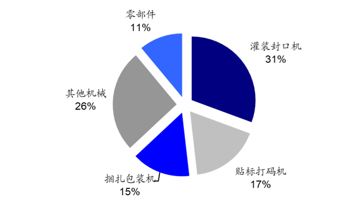 国内包装机械行业起步较晚但增长迅速。包装机械在我国属于新兴行业,起步较晚,经过30多年的发展,现已成为机械工业中的十大行业之一。近年来,在我国人均消费水平提高、消费需求升级换代的持续拉动下,食品、饮料、医药、化工、家用电器、造币印钞、机械制造、仓储物流、建筑材料、金属制造、造纸印刷、图书出版等众多行业领域生产企业把握发展机遇,不断扩大生产规模,提高市场竞争力,为我国包装机械行业快速发展提供了有效保障。从行业规模来看,行业整体规模自2013年起开始稳步增长;从下游应用领域来看,国内包装设备终端应用领域结构与全球结构类似,前三大领域同样为食品、饮料以及医药行业,占比分别为33%、21%、11%。对于包装设备大行业而言,灌装封口机、贴标打码机和捆扎包装机占比过半,是最主要的市场。