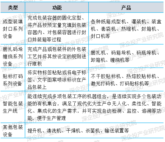 食品包装机械包含了食品加工制造机械和包装设备,其中食品机械主要可分为液态包装及乳制品装备、酿酒装备、肉类加工装备、饮料装备、烘焙糖制品装备、调味品装备、食品安全检测装备等类别。包装是商品进入流通领域的必要条件,而包装设备是实现产品包装的主要手段。按照工序划分,包装设备可以划分为成型装填封口系列设备、捆扎码垛缠绕系列设备、贴标打码系列设备、智能包装生产线及其他设备五类,如下表所示。