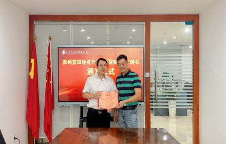 随后,蔡旭海主任为陈小剑总经理和游双副总经理分别颁发“漳州蓝田经济开发区招商大使”聘书,聘期2年。