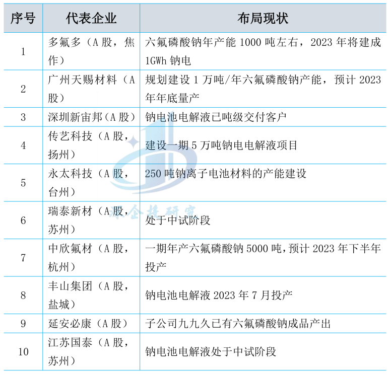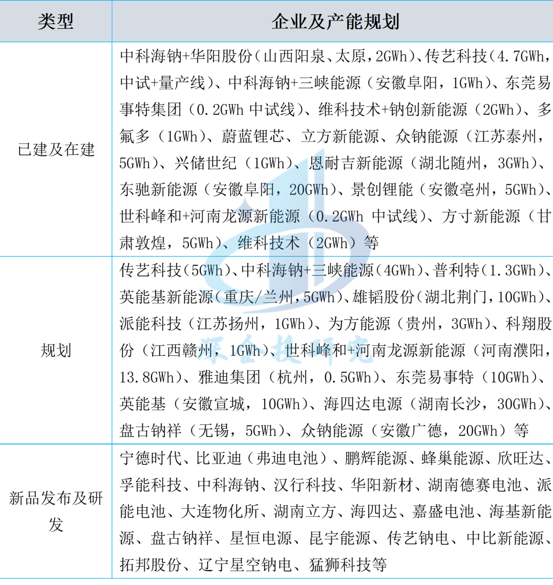 ——钠电池电芯单体及集成。钠电池整体上处于产业化前期,竞争格局尚未成熟。目前主要锂电池、动力电池厂商均在布局钠电池技术路线,同时也有大量新能源产业链的企业跨界布局,宁德时代计划于2023年实现钠离子电池量产和装机。中科海钠、华阳股份、鹏辉能源、多氟多、孚能科技、欣旺达、美联新材等已公开宣称最快将在2023 年以后形成钠离子电池量产能力。目前已建及在建钠离子电池产线的企业如下表所示。