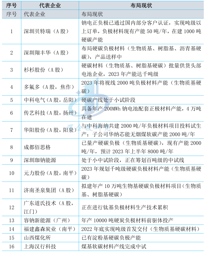 ——负极材料。不同于锂电池,钠离子电池负极一般不使用石墨,目前已经报道的钠离子电池负极材料主要包括碳基、钛基、有机类和合金类负极材料等,其中无定形碳材料(包括硬碳材料、软碳材料、复合无定形碳材料)最具有应用前景,现阶段负极厂商技术路线以硬碳为主、软碳为辅。其中,软碳储钠容量低,硬碳材料储钠位置和形式多样,理论容量可达350-400 mAh/g。硬碳材料在比容量、循环等方面具有明显优势,目前已经成为宁德时代等钠电池厂商的选择的负极技术路线之一。有望成为主流路线。