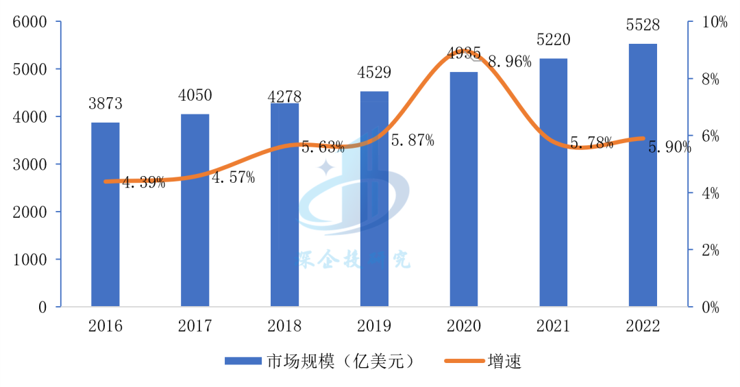 全球来看,伴随着经济水平提高和医疗保健意识增强,全球人口老龄化持续加速,生命健康需求不断拓展,医疗支出逐年递增,医疗器械行业市场规模稳健增长。根据Eshare医械汇数据,2022年全球医疗器械市场规模为5528亿美元,同比增长5.9%,如下图所示。