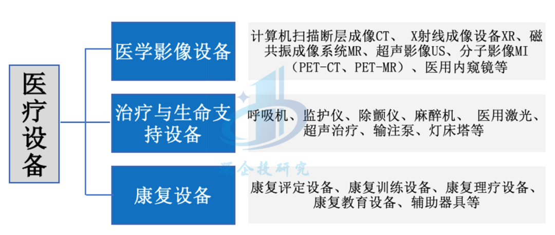 医疗设备包括医学影像设备、治疗与生命支持设备、康复设备等诊疗或辅助诊疗类产品。各类别代表产品如下。