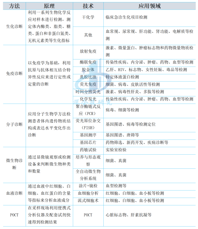 体外诊断根据检测原理方法以及检测环境条件可以分成包括生化诊断、免疫诊断、分子诊断、微生物诊断、血液诊断、现场即时检测(POCT)等主要领域,如下表所示。